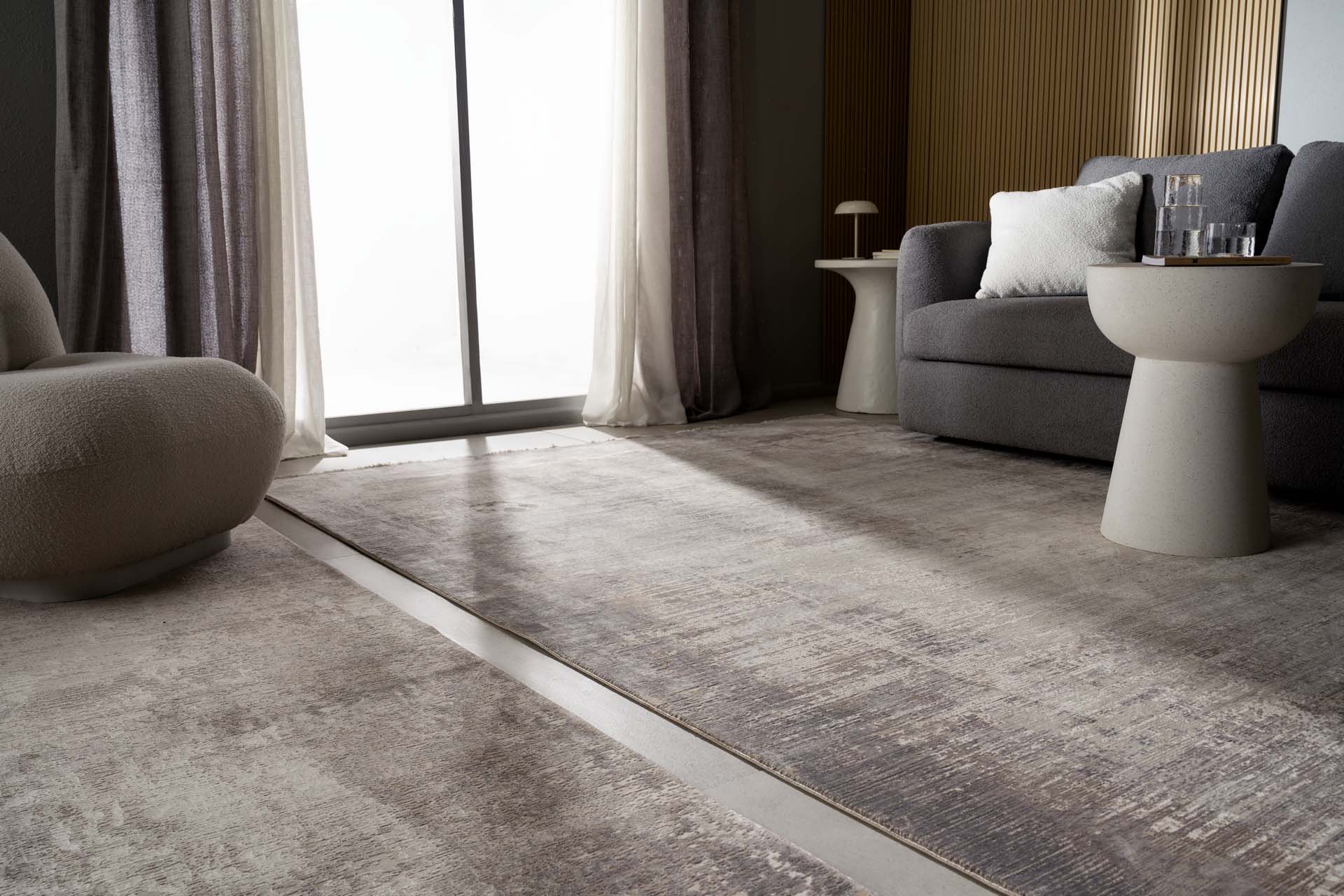 Μοντέρνο χαλί Bamboo Modern από τη Royal Carpet. Iδιαίτερα χαρακτηριστικά αποτελούν ο σχεδιασμός με σβησμένα μοτίβα, οι απαλοί χρωματικοί τόνοι σε γκρι, καφέ και κρεμ χρώμα καθώς και για η κατασκευή της από βισκόζη και shrink acrylic. Ξεχωρίζει επιπλέον για την πυκνότητα καθώς ξεπερνάει τους 1.600.000 κόμπους ανά τετραγωνικό μέτρο, γεγονός που το αναδεικνύει ως ένα από τα πιο πυκνοδουλεμένα μηχανοποίητα παγκοσμίως! Αναζητήστε τη σειρά Bamboo Modern σήμερα και αναβαθμίστε το χώρο σας.